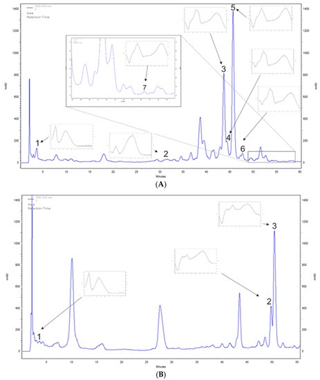 Examples of high-performance liquid chromatography–diode array detection (HPLC-DAD)-based separation (λ = 254 nm) of leaf extracts of (A) Acacia saligna: 1, gallic acid; 2, p-coumaric acid; 3, hyperoside; 4, quercetin 3-glucuronide; 5, rutoside; 6, isoquercetin; 7, quercetin; and (B) Lawsonia inermis: 1, gallic acid; 2, apigenin 5-glucoside; 3, apigetrin.