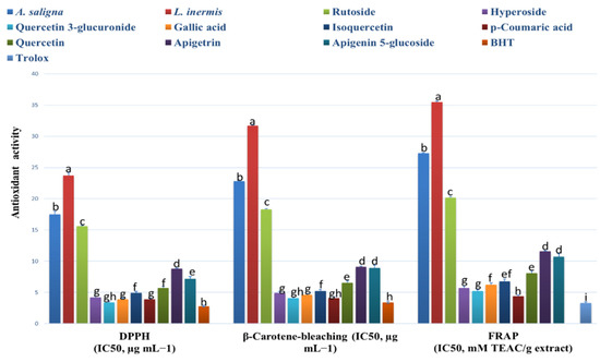 A. saligna and L. inermis antioxidant effects using 2,2-diphenyl-1-picrylhydrazyl (DPPH), β-Carotene bleaching and ferric reducing antioxidant power (FRAP) assays (expressed as IC50 in µg/mL). Identified polyphenol (rutoside, hyperoside, quercetin 3-glucuronide, gallic acid, isoquercetin, p-coumaric acid, quercitrin, apigetrin and apigenin 5-glucoside) antioxidant effects were also added. Values are expressed as mean ± standard deviation. TEAC: Trolox equivalent antioxidant capacity. Different letters among group of columns indicate significant differences (p ≤ 0.05).
