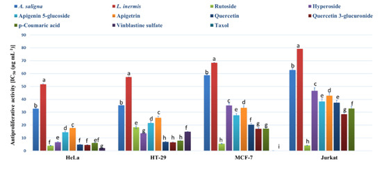 Antiproliferative activity (IC50 (µg mL−1)) of A. saligna and L. inermis methanolic extracts, rutoside, hyperoside, apigenin 5-glucoside, apigetrin, quercetin and p-coumaric acid against cancer cells: cervical adenocarcinoma (HeLa), T-cell lymphoblast like (Jurkat), breast adenocarcinoma cultures (MCF-7), colon adenocarcinoma (HT-29) and HEK-293 (normal human cells). HEK-293 was not presented in the figure and showed IC50 values > 400 µg mL−1 for all extracts and polyphenols. Different letters among group of columns indicate significant differences (p ≤ 0.05).
