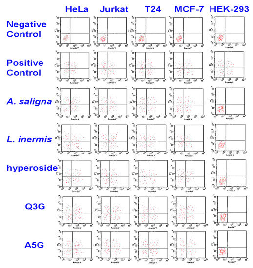 Cytotoxicity of A. saligna and L. inermis methanolic extracts, hyperoside, quercetin 3-glucuronide (Q3G) and apigenin 5-glucoside (A5G), as estimated with flow cytometry. There was an accumulation of early apoptotic cells in the lower-right quadrant as well as accumulation of the late apoptotic cell in the upper-right quadrant in treated cancer cells.