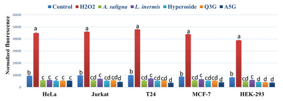 The effect of A. saligna and L. inermis methanolic extracts, hyperoside, quercetin 3-glucuronide (Q3G), and apigenin 5-glucoside (A5G) DPPH IC50 on the 2′,7′-dichlorofluorescein (DCF) fluorescence in HeLa, Jurkat, T24, MCF-7 and HEK-293 cells. A medium with 1 mM hydrogen peroxide (H2O2) was used as a positive control. The data are expressed as the mean ± SD of three experiments (four replicates per treatment). Different letters among group of columns indicate significant differences (p ≤ 0.05).