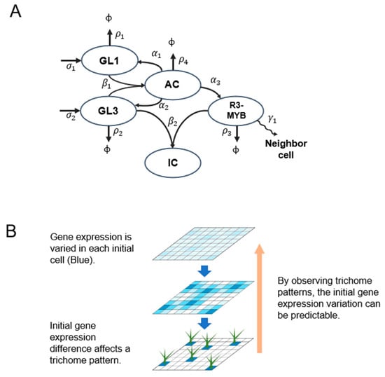Single-cell transcriptomics is currently the main method used to measure variation in gene expression between cells. However, single-cell transcriptomics is costly, and separating plant cells from organs requires enzymatic treatment, which can artificially alter gene expression profiles. Although variation in gene expression in higher order multicellular organisms was recently measured, differences of gene expression variation between genes has not yet been demonstrated []. The trichome, a hair-shaped organ that develops from a pluripotent epidermal cell at an early stage of leaf development, performs multiple functions including herbivore defense, leaf moisture retention, and metabolite secretion. Trichomes serve as a useful trait for studying environmental adaptation in plants. The distribution pattern of leaf trichomes in Arabidopsis thaliana is a suitable system for investigating variation in gene expression in plants for the following reasons. First, the trichome position on a leaf is equally and probabilistically distributed [,,], thus, the trichome distribution pattern is believed to emerge stochastically. Second, the gene regulatory network related to trichome development has been well studied [,,]; GLABRA 3 (GL3), which encodes a basic helix-loop-helix transcription factor, is critical for cell fate determination during trichome formation. The GL3 protein forms a complex with GL1, an R2R3-MYB transcription factor, to control the expression of downstream genes. The GL3-GL1 complex activates not only positive regulators of trichome cell fate determination, but also R3-MYB transcription factors that directly interact with GL3 in neighboring cells to inhibit the formation of the GL3-GL1 complex. Consequently, these cells do not form trichomes. Third, the trichome distribution pattern is explained by Turing’s reaction-diffusion (RD) model [,,], and a trichome distribution pattern was mathematically and experimentally demonstrated [] (Figure 1A). Since the pattern formation required stochastic fluctuations, the previously proposed RD model uniformly added a stochastic noise. However, in the model, the variations in individual factors were neglected. We speculated that differences in gene expression between epidermal cells immediately before trichome cell fate determination can affect the trichome distribution pattern (Figure 1B). To predict the effect of variations in gene expression between epidermal cells on trichome development, a proper mathematical model and further experiments are needed.