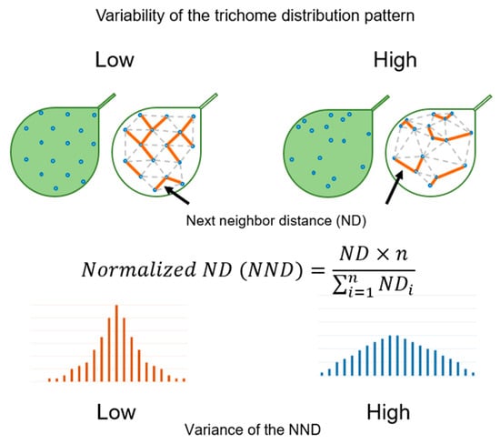 Theoretical interpretation of the quantification of the trichome distribution pattern. The orange line indicates the shortest path between trichomes, referred to as next-neighbor distance (ND). The equation used to calculate the normalized ND (NND) is shown in the middle. The histogram of NNDs is shown at the bottom. High variability of the trichome distribution pattern demonstrates high variance of the NND distribution.