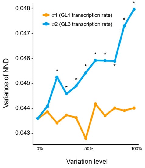 In this study, the F test was used to assess the statistical significance of differences in variance as compared with no particular variation in each parameter. After 500 trials, our simulations showed that both the regularity of trichome patterns and the number of trichomes were affected in some parameters (Figure S3). Since we focused on the parameters that influenced only the regularity of the trichome distribution pattern, we considered the parameters that affected only variances and not the number of trichomes, and ignored other parameters that affected variances of NND distributions. There are three types of parameters in the model; σ, which represents the rate of gene expression; ρ, which represents the rate of degradation; and β, which represents the rate of protein-protein association. Consequently, σ2 was the only parameter that increased the variance of NNDs as the variation of the parameters increased, suggesting that a change in σ2 (rate of GL3 expression) affects the regularity of the trichome distribution pattern (Figure 3). It is worth noting that σ1 (rate of GL1 expression) did not affect this pattern (Figure 3), even though GL1 is a key component of the active GL1-GL3 complex that controls downstream genes modulating trichome cell fate determination [,]. These results suggest that the regularity of the trichome distribution pattern reflects variations in GL3 expression according to the mathematical model.