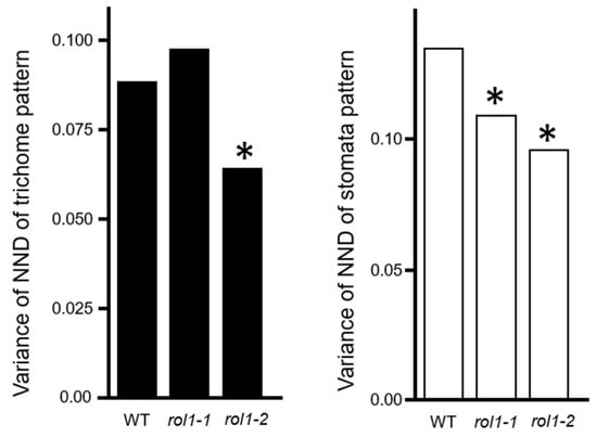 Normalized next-neighbor distance (NND) variances of trichomes and stomata of Columbia (Col) and rol1 mutant. Two alleles of the rol1 mutant showed increased regularity of stomata patterns (white); however, the trichome pattern showed no correlation (black). WT, wild-type, rol1-1 and rol1-2, two alleles of rol1 mutants; * p < 0.05 (F test).