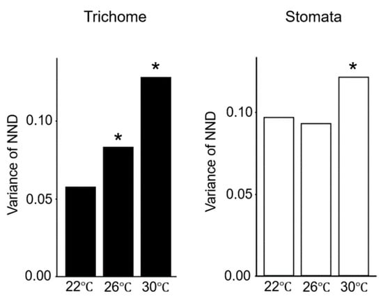 Normalized next-neighbor distance (NND) variances of trichomes and stomata of Col plants grown under mild heat stress. Variances of trichomes (black) and stomata (white) of Col plants grown at 22 °C, 26 °C, and 30 °C are shown. NND variances of trichomes increased with the increase in temperature (black). * p < 0.05 (F test).