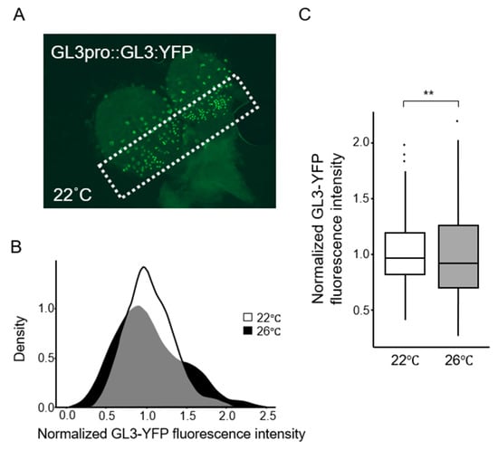 Variations in GL3 protein level. (A) Representative image of GL3-YFP fluorescence signal. The GL3-YFP fluorescence intensity was measured from the area outlined by a white dotted line, which shows the initial cells in trichome development. (B) Distribution of GL3-YFP fluorescence in plants grown at 22 °C (white) and 26 °C (black). (C) Box plots of variances of intensities of normalized GL3-YFP fluorescence shown in panel B. ** p < 0.01.