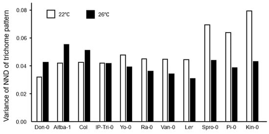 Based on the above findings, we speculated that variations in gene expression under certain conditions could be predicted based on the regularity of the trichome pattern, and this could have an adaptive significance. We were also curious to determine which natural factors are responsible for the gene expression variation. We addressed these questions by comparing the regularity of trichome distribution patterns between of A. thaliana accessions adapted to the different climatic conditions [,]. A total of 11 accessions (Don-0, Aitba-1, Col-0, IP-Tri-0, Yo-0, Ra-0, Van-0, Ler-0, Spro-0, Pi-0, and Kin-0) were grown together in one plate under a normal or modestly high temperature (Figure 7). Strikingly, the results indicated that the change in NDD variance varied between accessions. The accessions could be divided into two groups at 26 °C: the high-variance group, comprising Don-0, Aitba-1, and Col; and the low-variance group, comprising Ler and other accessions. IP-Tri-0 was the only accession that showed no difference in NND variance distribution between at 22 °C and 26 °C. This led us to another question, i.e., whether gene expression variations would reflect the specific environment to which an accession is adapted.