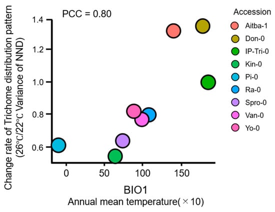 To evaluate the relationship between gene expression variation and environmental factors, we used the BioClim data set, which comprises 19 global land surface datasets (Table 2) [,]. Since Col and Ler have been grown under experimental conditions for more than 70 years, we excluded Col and Ler in this analysis. We calculated the ratio of variance at 26 °C to that at 22 °C. When gene expression variation increased under mild heat, the ratio of variances increased beyond 1.0. We analyzed the ratio of variances of 11 accessions and compared these ratios with BioClim indices (Figure S5). We found that three indices (BIO1, BIO10, and BIO11) showed significant positive correlations with the ratio of variances of NND. Interestingly, all of these three indices represent mean temperature under certain conditions. In particular, BIO1, the index of the mean of annual temperature, was positively correlated with the variability in the trichome distribution patterns (Figure 8). These results demonstrate a strong relationship between gene expression variation and environmental factors, especially temperature, suggesting that temperature affects gene expression variations.