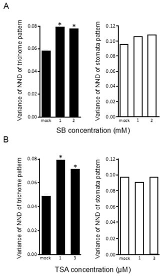 It has been reported that the epigenetic status of a gene determines its expression level []. We therefore quantified trichome patterns by analyzing gene expression variations in leaves of plants treated with sodium butyrate (SB) or trichostatin A (TSA), both of which inhibit histone acetyltransferase activity in plants []. Since histone modifications are related to various biological processes, their perturbation can have pleiotropic effects. Accordingly, treatment with 5 mM SB, a standard concentration used in experiments, reduced overall plant size (Figure S6). However, low concentrations of SB and TSA perturbed trichome but not stomata patterns (Figure 9), indicating that modest perturbation of histone modifications has non-uniform effects on gene expression variations, which in turn increase the variability of the trichome distribution patterns.