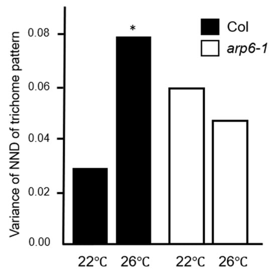 Since epigenetic modifications drastically alter nucleosome positions, we surveyed the nucleosome positions in the GL3 genic region using publicly available data (http://epigenomics.mcdb.ucla.edu/Nuc-Seq), which suggested that the promoter region of GL3 was relatively open (Figure S7A). To determine whether the chromatin was altered in the GL3 genic region, we performed the micrococcal nuclease (MNase) assay. No differences were observed in nucleosome positions at 22 °C and 26 °C (Figure S7B). Considering our findings that the gene expression of GL3 is influenced by temperature [], we focused on H2A.Z, which is a key histone variant involved in the thermosensing process in Arabidopsis. To determine whether the trichome distribution pattern is altered in the absence of a functional H2A.Z, we observed the variability in trichome distribution pattern in arp6-1 mutant, in which eviction of H2A.Z nucleosome was perturbed [,]. Strikingly, Figure 10 shows that the variability in the trichome distribution pattern of the arp6-1 mutant grown at 26 °C was significantly lower than that in its background accession (Col). Moreover, the variability in the trichome distribution pattern of arp6-1 was higher at 22 °C than at 26 °C.