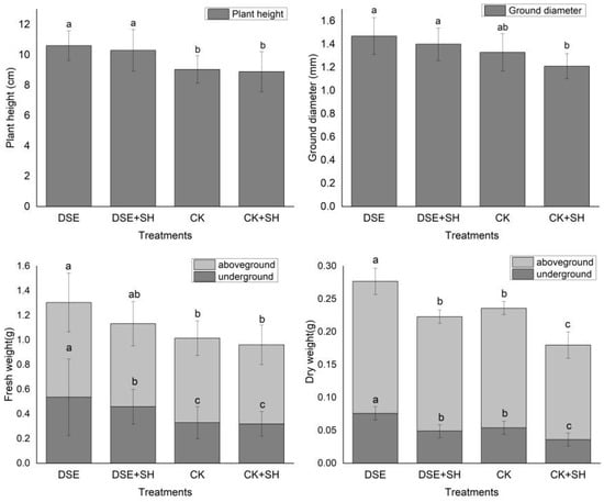Dark septate endophytes (DSE) also has an effect on plant growth. The direct effects include promoted plant growth, an increase in biomass, as well as boosting the root structure and development of plants. In our research, dark septate endophytes strain A024 enhanced annual seedling growth, compared to CK treatment, underground and aboveground fresh weight, seedling height, aboveground and underground dry weight of seedlings from DSE treatment increased by 17.31%, 62.91%, 12.09%, 40.74%, 10.43%, respectively. Similarly, fresh underground weight, ground diameter, seedling height, underground and aboveground dry weights under DSE + SH treatment increased by 15.82%, 15.71%, 43.43%, 36.11%, 36.11%, and 20.83%, respectively, compared to CK + SH treatment (