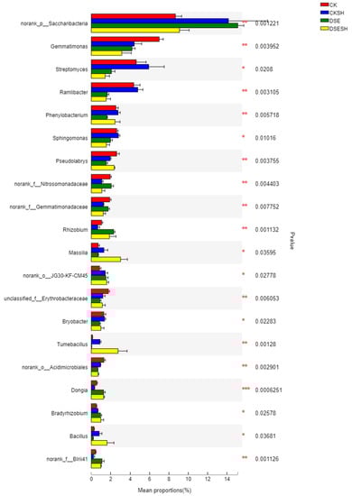 mongolica is dominated by Proteobacteria, with the highest relative abundance among the four treatments. However, the differences between the four treatments are not significant. The relative abundance of the Actinobacteria, Gemmatimonadetes were higher in CK and CK + SH treatments, whereas Bacteroidetes, Chloroflexi and Firmicutes were higher in DSE and DSE + SH treatments (