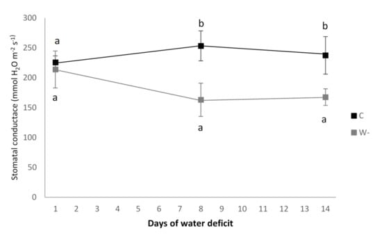 | Stomatal conductance (mmol H2O m−2 s−1) | 253 ± 25 b | 163 ± 28 a | <0.001 |