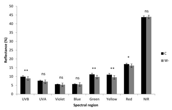 | UV-B–absorbing compounds (rel. units cm−2) | 160 ± 23 a | 232 ± 27 b | <0.001 |
