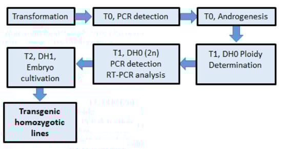 - Brew-Appiah, R.A.T.; Ankrah, N.; Liu, W.; Konzak, C.F.; Von Wettstein, D.; Rustgi, S. Generation of doubled haploid transgenic wheat lines by microspore transformation. PLoS ONE 2013, 8, e80155. [Google Scholar] [CrossRef] [PubMed]