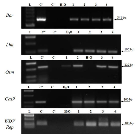 - Cejnar, P.; Ohnoutková, L.; Ripl, J.; Vlčko, T.; Kundu, J.K. Two mutations in the truncated Rep gene RBR domain delayed the Wheat dwarf virus infection in transgenic barley plants. J. Integr. Agric. 2018, 17, 2492–2500. [Google Scholar] [CrossRef]