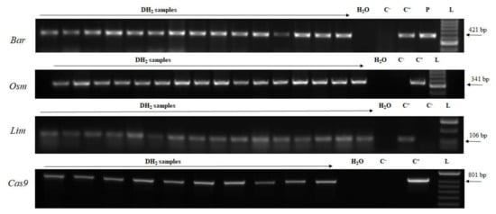 - Kapusi, E.; Hensel, G.; Coronado, M.J.; Broeders, S.; Marthe, C.; Otto, I.; Kumlehn, J. The elimination of a selectable marker gene in the doubled haploid progeny of co-transformed barley plants. Plant Mol. Biol. 2013, 81, 149–160. [Google Scholar] [CrossRef] [PubMed]