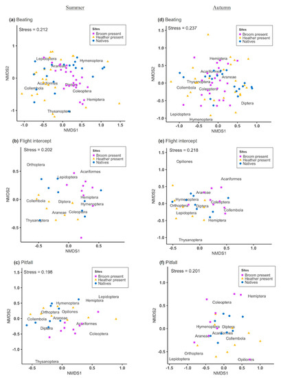 Non-metric multidimensional scaling (NMDS) plots for arthropod community composition in weed-invaded and non-invaded sites in summer (a–c) and autumn (d–f). Arthropods were caught by beating tray method, flight intercept, and pitfall traps.