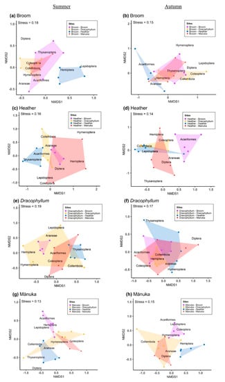 Non-metric multidimensional scaling (NMDS) plots showing the arthropod community composition on (a,b) broom, (c,d) heather, (e,f) Dracophyllum, and (g,h) mānuka paired with different plants in summer and autumn. Arthropods collected by the beating tray method (n = 5 for each group).