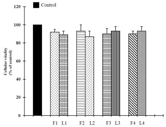Cell growth of normal human non-immortalized buccal fibroblast cells (BFC) treated with essential oils (F1, L1, F2, L2, F3, L3, F4, L4) at 25 µg/mL concentration. * Significant vs. control untreated cells (p < 0.001).