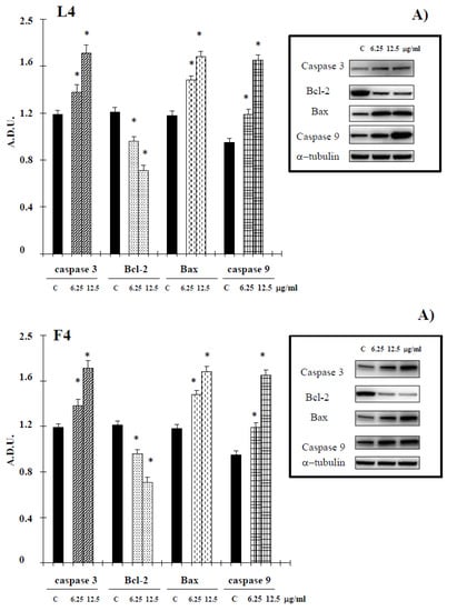 Levels of caspase 3, Bcl-2, Bax, cleaved caspase-9 proteins in A375 cells untreated and treated with essential oils F4 and L4 for 72 h. Values are expressed as arbitrary densitometric units (A.D.U.) corresponding to signal intensity present on the autoradiography of Western blots. A) Representative blots of control and treated cells are reported. * Significant vs. control untreated cells (p < 0.001).
