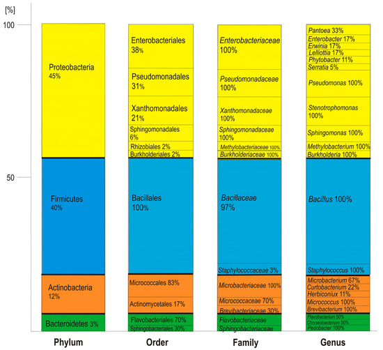 Figure 2. Percentages of in total 113 studied bacterial strains, identified on the basis of 16S rRNA gene sequences, in the main taxonomic groups.
