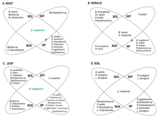 Figure 3. Shared and distinct bacterial taxa identified as root (A), nodule (B), and leaf (C) endophytes of T. repens and rhizosphere soil (D) originating from three metalliferous sites: Bolesław (BOL), Saturn (SAT), Bukowno (BUK), and the Bolestraszyce (NP) non-polluted reference site. Symbol X indices absence of common taxa.