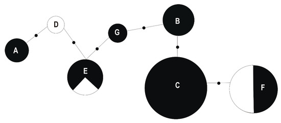 Figure 4. Minimum spanning tree (MST) based on a pairwise distance matrix computed on the basis of 900-bp 16S rRNA gene sequence analysis of studied genotypes (symbols A–G) of Bacillus megaterium strains derived from the Bolesław, Saturn, and Bukowno waste heaps (metalliferous) and Bolestraszyce non-polluted reference (non-metalliferous) area. The size of the circle corresponds to the genotype frequency. Small dots on the tree edges correspond to the number of nucleotide differences in 900-bp 16S rRNA gene between nodes representing B. megaterium genotypes (A–G). Dark parts of the circles correspond to the frequency of B. megaterium strains with a given genotype in a metalliferous area.