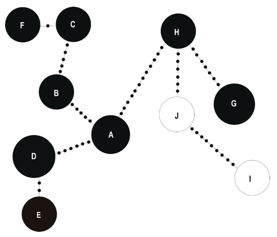 Figure 5. Minimum spanning tree (MST) based on a pairwise distance matrix computed on the basis of 900-bp 16S rRNA gene sequence analysis of studied genotypes (symbols A–J) of Stenotrophomonas maltophilia strains derived from the Bolesław, Saturn, and Bukowno waste heaps (metalliferous) and Bolestraszyce non-polluted (non-metalliferous) areas. The size of the circle corresponds to the genotype frequency in the whole sample. Small dots on the tree edges correspond to the differences in the number of different nucleotides in 900-bp 16S rRNA gene between nodes representing S. maltophilia genotypes (A–J). Dark parts of the circles correspond to the frequency of S. maltophilia strains with a given genotype in a metalliferous area.