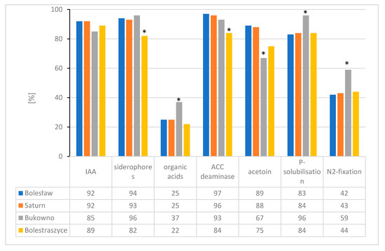 Figure 6. Percentages of strains isolated from rhizosphere soil and tissues of T. repens originating from the Bolesław, Saturn, and Bukowno metalliferous waste heaps and the Bolestraszyce non-polluted reference area demonstrating the tested in vitro plant growth promotion traits. The asterisks indicate statistically significant differences at p < 0.05.