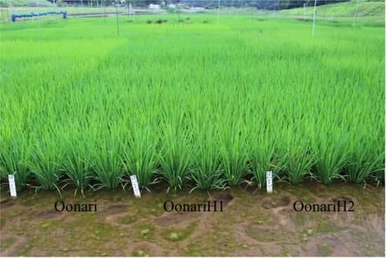 Twelve higher yield candidates were tested in the yield trials in 2016. Table 1 and Table S2 show the performances of mutants with standard fertilizer application and heavy fertilizer application, respectively. The heading date of FukuhibikiH6 was the same as that of the original variety Fukuhibiki, while FukuhibikiH7 was one day earlier in Table 1. In addition to grain yield, brown rice weight is also an important target trait. Fukuhibiki and its mutants showed nearly 6 t/ha brown rice yield and this was higher than the average Japanese brown rice yield. Other varietal groups also showed higher yield. Lodging degrees of all the lines and varieties were limited. Major diseases and other causes of major losses were not observed. The conditions under which these yield evaluations were conducted were considered to be good. The brown rice yield of FukuhibikiH6 was higher than that of Fukuhibiki, but FukuhibikiH7 was lower than its original. The highest yield advantage among the 12 mutants over their respective originals was 7.5% this year and this was observed in the grain weight of YamadawaraH3 (Table 1). No significant differences were observed between any mutant and its original in two replications of this experimental design. Figure 1 showed OonariH1 and OonariH2. All the observed appearances of the mutants were quite similar to their original varieties.