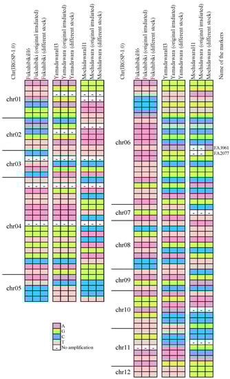 2.5. DNA Marker Analysis between Higher Yield Mutants and Their Original Varieties