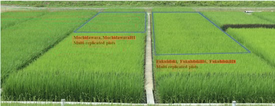 Multi-replicated yield trial plots of MochidawaraH1, FukuhibikiH6, and FukuhibikiH8 at maximum tillering stage in paddy fields in Ibaraki, Japan, in 2018.