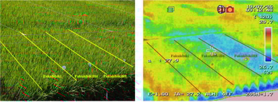 Yield evaluation (left) and thermo-camera observation (right) of FukuhibikiH6 and FukuhibikiH8 at maximum tillering stage in paddy field in Ibaraki, Japan, in 2019. Note: thermo-camera was “InfReC R300SR-S” of AVIONICS CO., LTD.