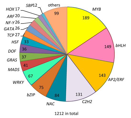 TFs have been studied in the available plant genome sequences. For example, about 8–9% of the 27,411 protein-encoding genes in the Arabidopsis genome (TAIR10) were identified as putative TFs [7,8,9]. In the rice genome, about 10% of the predicted 22,896 genes (MSU Rice Genome Annotation, Release 7) were suggested to encode TFs and in tomato, about 6% of the genes in the genome putatively encode TFs [10]. In cucumber, 1575 putative TFs were identified in the genome in the iTAK database [8], which represents about 7% of the 23,248 predicted genes ([11,12]; version 2.0).