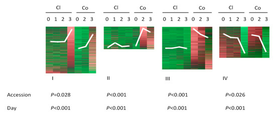 Regulation of gene expression by feeding of spider mites (Tetranychus urticae) during one, two or three days in two cucumber accessions (Chinese long (Cl) and Corona (Co), upper part) and effects of accessions and days of feeding on the expression of the differentially expressed genes (DEGs) ((p-value), lower part). All DEGs were self-organized using GeneMaths XT (http://www.applied-maths.com) into four groups (I to IV) based on their expression at different time points of feeding. White lines indicate the general expression trend for each group. DEGs from each group were tested separately using a general linear model (GLM) (IBM SPSS STATISTICS, version 22). Upregulated or downregulated abundance of transcripts was set as variable and the accessions and days of feeding by spider mites were set as factors for which the effect was tested.