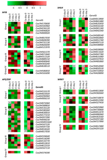 Expression profiling of cucumber transcription factors of four families most differentially regulated by spider-mite feeding (T. urticae). Reads Per Kilobase of transcript per Million mapped reads (RPKM) values of the genes obtained from RNA-seq were introduced into Genemaths XT and were normalized to the standard deviation of each gene. Color coding: green represents low expression; red represents high expression. Grey squares with cross indicate that no transcripts were detected.