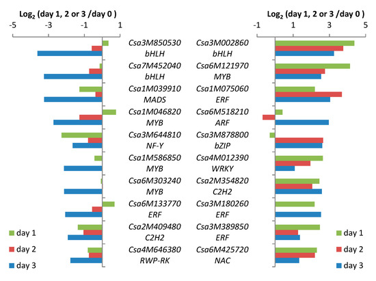 Spider-mite feeding resulted in differential expression of TF genes in both directions. The relative transcript abundance of a putative bHLH gene (Csa3M002860) increased about 20-fold (log2Ration ≈ 4.4) one day after the onset of spider-mite feeding compared to transcription in non-infested leaves making it the most strongly affected TF gene in spider mite-infested cucumber leaves. Although the absolute abundance of the transcripts of this TF gene decreased on days 2 and 3, expression was still about 14- and 10-fold higher than in non-infested plants, respectively (Figure 4). A similar pattern was found for a MYB TF gene, Csa6M121970, with the strongest induction (18-fold) on day 1, and about 7- and 6-fold higher compared with non-infested plants on succeeding days. The other putative TF genes that are depicted in the right panel of Figure 4 have the strongest induction of expression on different days, but all belong to the ten most upregulated TFs. This group includes three ERFs. In contrast, the two strongest downregulated TF genes belong to the bHLH family (Figure 4, left panel). Transcription of the bHLH TF gene, Csa3M850530, first increased slightly after one day of feeding and subsequently decreased to approximately half the amount of transcripts of non-infested leaves on day 2 and to 8% (log2Ration ≈ 3.6) on day 3. Expression of the bHLH TF gene, Csa7M452040, showed a similar pattern, resulting in a decrease in transcripts to 10% (log2Ratio ≈ 3.3) compared to non-infested plants after three days. The expression of the ten strongest suppressed TF genes decreased mainly on day 3 and this category includes three MYBs.