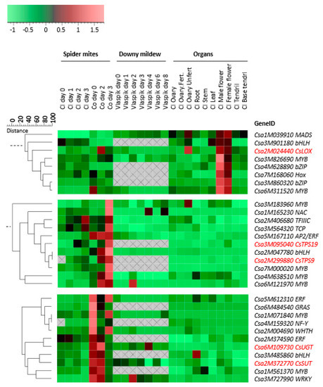 Co-expression of a selection of metabolism-associated genes (indicated in red font, CsLOX, CsTPS9, CsTPS19, CsUGT, CsSUT) and TF genes during feeding by spider mites (T. urticae) [44], downy mildew (p. cubensis) [45] infection and in different non-infested/non-infected organs [12] of cucumber accessions Chinese long (Cl), Corona (Co) and Vlaspik. The scale indicates the distance of the similarity of the expression profile of these genes. Color coding: green represents low expression and red represents high expression. Grey areas with cross indicate that no transcripts were detected.
