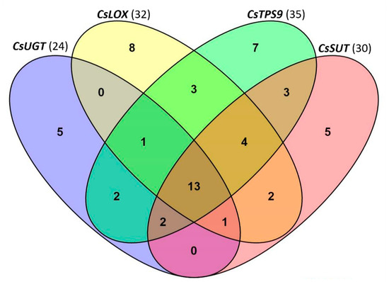Specific and shared binding motifs found in promoter sequences of CsLOX (upregulated), CsTPS9 (upregulated), CsUGT (downregulated) and CsSUT (downregulated). Total number of motifs for each gene is indicated in brackets following the gene name.