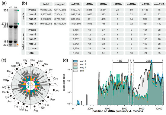 Figure 1. Analysis of the small RNA distribution in Arabidopsis thaliana cells: (a) RNA was isolated from cell lysates (cl) and nuclear fractions (nu) and subjected to agarose gel analysis followed by ethidium bromide staining, and migration of the rRNA precursor is indicated on the left. The presence of the 35S as well as of 27SB rRNA and the absence of 23S rRNA in the nuclear fraction are highlighted by arrowheads. (b) The number of reads (top) and of detected molecules (bottom) is presented. The number of total (column 2) and mapped reads (column 3) is given for each fraction. Subsequently, the number of reads mapped to genes coding for specific RNAs (according to TAIR10) is presented for cell lysate (lysate) and the three replicas of the nuclear fraction (nuc-1 to nuc-3). These ncRNAs are not annotated in TAIR10. On the bottom, the total number of identified RNAs in cell lysate (lysate), the three biological replicas of the nucleus (nuc-1 to nuc-3), accumulated results for nuclear fractions (to. nuc), or all fractions (total) are shown. (c) The codon is indicated as a color code from 5′ (center) to 3′ (outer rim). The total reads per base for the tRNA for each codon is shown (middle light grey background; grey bar: maximal value in one of the nuclear fractions; dark gray: cell lysate; logarithmic scale from 1 to 104). The amino acid occurrence in the proteome of A. thaliana is shown in logarithmic scale between 105 and 106 (outer white rim, black dot). (d) The reads per base found for the rRNA transcript is shown for the four experiments according to the color code on the left. The regions coding for 18S, 5.8S, and 25S are indicated.