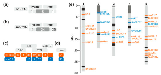 Figure 2. The detected snRNAs and snoRNAs in A. thaliana cells. (a,b) The distribution of the snRNAs (a) and snoRNAs (b) annotated in TAIR10 in cell lysate and nuclear fractions is shown. (c,d) The number of identified snoRNAs with C/D box, H/ACA, or unknown fold known present in snOPY or snoRNA DB (c) or additionally identified (d) is presented. For the annotated snoRNAs (Cc), the number for the (predicted) target rRNA is given. (e) The general chromosomal localization of the newly identified putative snoRNAs (d) is shown. The color code indicates the distribution in the two structural groups as in (c). rDNA (grey) and regions with high frequency snoRNAs occurrence (black; [26]) are highlighted.