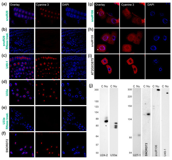 Figure 4. snoRNAs of the C/D box family: (ai) FISH probes (Table S4) against C/D box snoRNAs (Tables S1–S3) were incubated with root cells of A. thaliana plants (second), and DNA was visualized by DAPI staining (third). The overlay between FISH probe signal and DAPI staining is shown for representative cells (first). In (b,e), images for FISH analysis after RNase treatment of the cells are shown exemplarily for snoR29 and U33a. (j) RNA isolated from nuclear depleted cytoplasm (cy) and nuclear fraction (nu) were subjected to acrylamide gel-based separation. The migration of the indicated snoRNAs was probed by northern blotting with specific probes (Table S5). Migration of RNA standards is shown on the left.