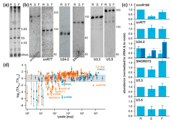Figure 6. Tissue-specific distribution and localization of snoRNAs: (a) RNA was isolated from roots (R), shoots (S), or flowers (F) of A. thaliana. Ethidium bromide-staining confirmed RNA quality and was used as loading control. (b) Northern blot analysis of the fractions shown in (A) with probes for indicated snoRNAs: Migration of nucleotide standards is shown (left). (c) Density of bands (Figure 6b) was quantified and normalized to 5.8S and 5S density (Figure 6a) and to the abundance in roots. For U24-2, values for the upper (light blue) and lower band (dark blue) were normalized to the density of the lower band. (d) Abundance of all identified snoRNAs expressed as transcripts per million in cell lysate was plotted against the log2 of the ratio of the average abundance in the nucleus and lysate (SD: error bar). The color code is indicated on the right. The snoRNAs with high abundance in the lysate are named.