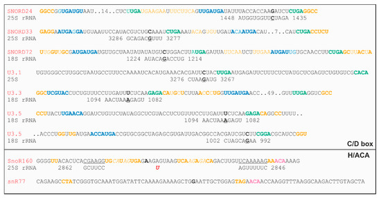 72. Marz, M.; Gruber, A.R.; Höner Zu Siederdissen, C.; Amman, F.; Badelt, S.; Bartschat, S.; Bernhart, S.H.; Beyer, W.; Kehr, S.; Lorenz, R.; et al. Animal snoRNAs and scaRNAs with exceptional structures. RNA Biol. 2011, 8, 938–946. [Google Scholar] [CrossRef] [PubMed]