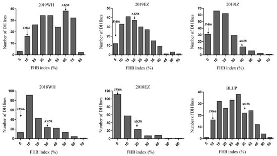 Frequency distribution of FHB index for 209 doubled haploid lines derived from Jingzhou66 and Aikang 58. All data are means of two replicates for each environment. Arrows indicate the disease severities of the parents. WH, Wuhan; EZ, E’zhou; JZ, Jingzhou; best linear unbiased prediction (BLUP).