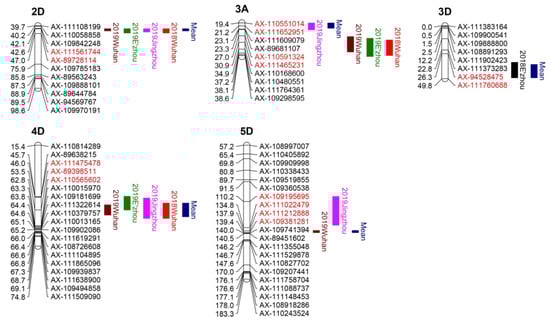 Estimates of QTL positions and their effect in each environment were determined by inclusive composite interval mapping of additive function (ICIM-ADD) in IciMapping V4.1 [,]. A LOD threshold of 2.5 was set to declare a significant QTL. The effects of the detected QTL were estimated as the phenotypic variance explained by ICIM. QTL situated within the same interval or overlapping confidence regions were considered identical, while those identified in more than one environment were considered stable. To compare the physical positions of the QTL identified in the current study and known QTL, closely linked markers were blasted against the Chinese Spring reference genome sequences (IWGSC RefSeq v1.0) or searched on the website http://202.194.139.32/ to obtain the physical position.