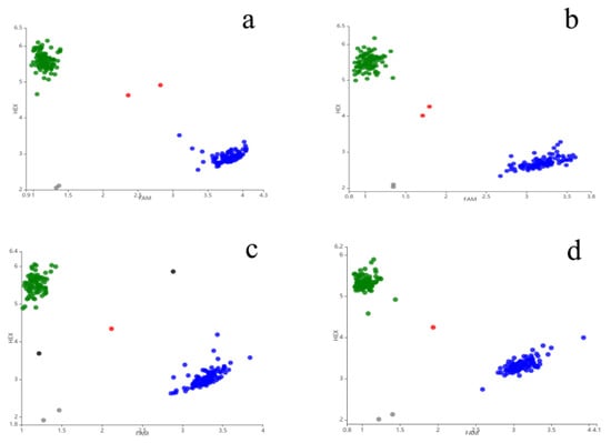 Profiles of four PARMS markers for mapped FHB resistance loci. (a) PARMS-AX-111561744, QFhb.hbaas-2DS, green dots: Susceptible, and blue dots: Resistant; (b) PARMS-AX-110591324, QFhb.hbaas-3AL, green dots: Susceptible, and blue dots: Resistant; (c) PARMS-AX-89398511, QFhb.hbaas-4DS, green dots: Resistant, and blue dots: Susceptible; and (d) PARMS-AX-109381281, QFhb.hbaas-5DL, green dots: Resistant, and blue dots: Susceptible.