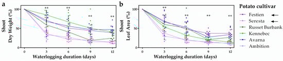 Potato cultivars show variation in waterlogging tolerance. Relative shoot dry weight (a), relative leaf area (b) of 6 elite potato (S. tuberosum) cultivars during 12 days of waterlogging. Values are relative to non-waterlogged plants who were set at 100% per time-point (a,b). Asterisks indicate significant differences between the Festien (purple) and Seresta (pink) cultivars per time-point and these were the cultivars selected for further analysis (indicated by arrows, ** p < 0.01, Generalized linear model, Tukey’s honestly significant difference (HSD), n = 10 plants).